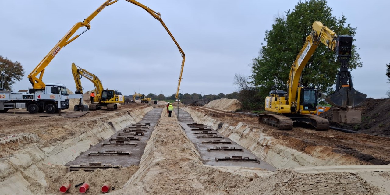 Seit November sind wir auch in NRW aktiv, um das über 80 km lange Teilstück von der Rheinquerung bei Rees bis nach Osterath fertigzustellen. Über unsere Dispoplätze in Kalkar und Kerken erfolgen die Organisation der Einsätze, der Umschlag der Materialien sowie die Flüssigbodenherstellung.